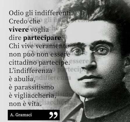“Odio gli indifferenti. Credo che vivere voglia dire essere partigiani. Chi vive veramente non può non essere cittadino e partigiano. L’indifferenza è abulia, è parassitismo, è vigliaccheria, non è vita. Perciò odio gli indifferenti.