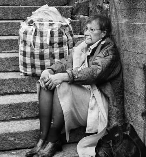 Eppure, in questa immagine, è seduta per strada, vestita con abiti dimessi, simile a una senzatetto.