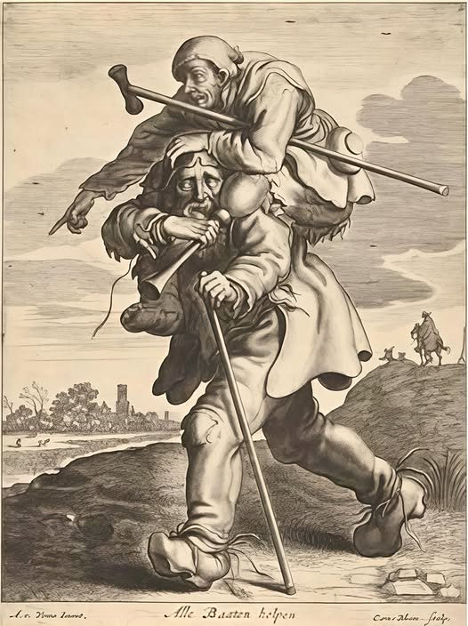 Lo zoppo osserva e guida il cieco, spiegandogli dove andare; il cieco ascolta lo zoppo, facendo il possibile per evitare ostacoli ed inciampi.