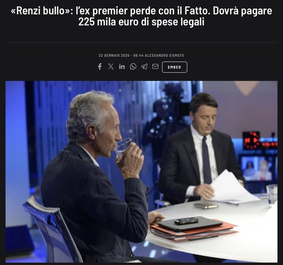 Matteo Renzi ha perso in appello contro il Fatto Quotidiano in una causa per diffamazione al tribunale civile di Firenze. E ora dovrà pagare 225.674,42 euro di spese legali. «Con le cause civili contro Travaglio conto di pagare tre o quattro rate del mutuo. La chiamerò villa Travaglio. Anzi no, porta un po’ sfiga», aveva detto l’ex premier nel febbraio 2019. In occasione del suo 50esimo compleanno offrì un pranzo a base di “pappa col pomodoro, ragù di cinta senese, il brunelleschiano peposo all’imprunetana, gelato tipico fiorentino”.