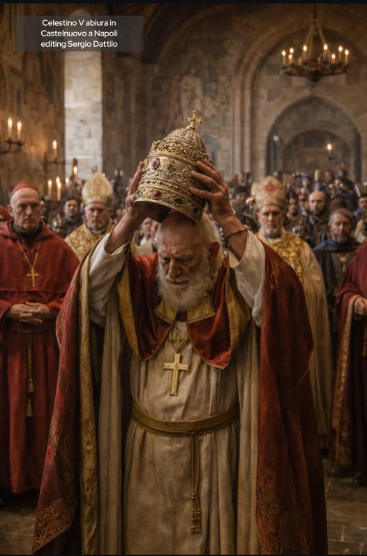 Davanti alle alte cariche della Chiesa riunite in concistoro il vecchio eremita, con voce tremante, lesse la dichiarazione di abiura, si tolse la tiara dal capo, si liberò del manto, si sfilò l’anello papale e rimase in cotta bianca; dopo di che si affacciò a una finestrella e, per l’ultima volta, benedisse il popolo che si era adunato commosso intorno al castello senza riuscire a capire il motivo di un gesto tanto inconsueto quanto sconvolgente.